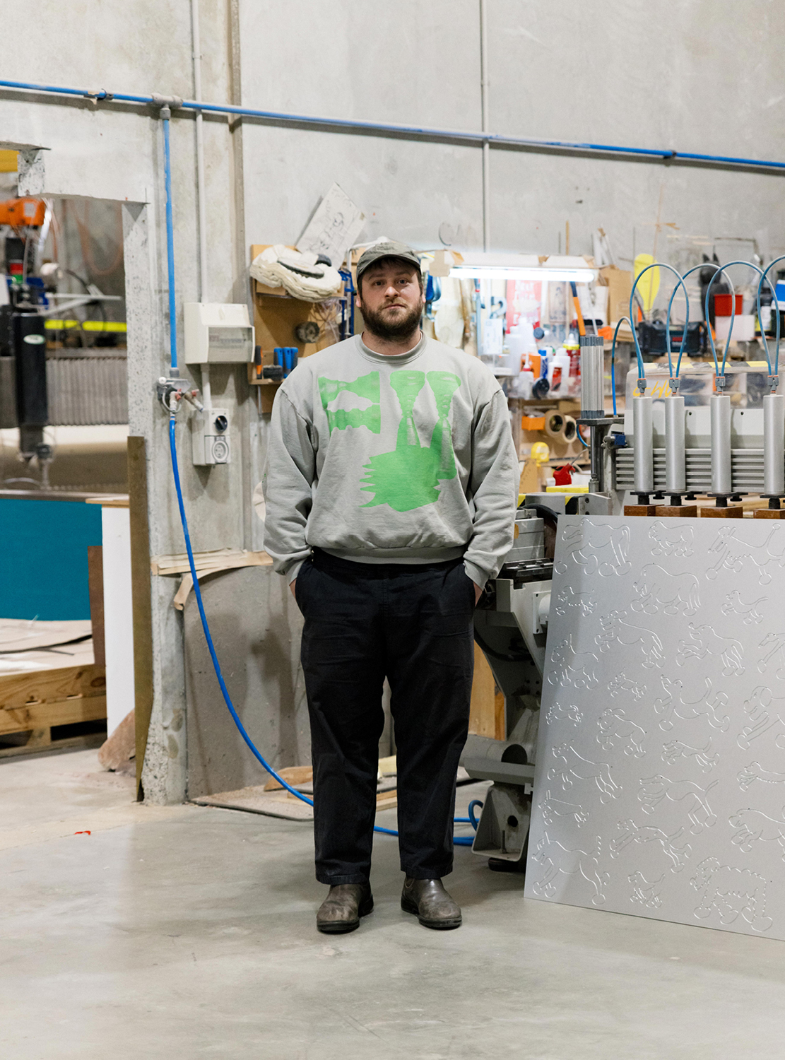 Tim’s graphic design background feeds directly into visual investigations of human connection and inner dialogues; exploring how these construct relations to our physical reality and serve as points of departure for rearticulating how we think of the human body, nonhuman companions, and inanimate objects. By reworking common materials and cultural motifs, be it characters from Arthurian folklore, playground materials, industrial machinery, or gym equipment, Tim’s projects present micro-worlds that pull disparate objects and ideas into relation of each other. In doing so, Tim’s outcomes reinterpret the real world in playful and humorous ways that shift how familiar forms are understood.